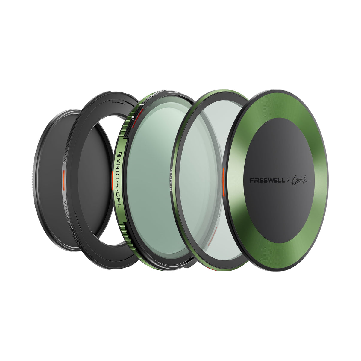 Brandon Li x Freewell magnetic VND/CPL kit with 1-10 stops using ND32 Filter, includes 72mm base ring, ND32 Filter, front & rear lens caps.